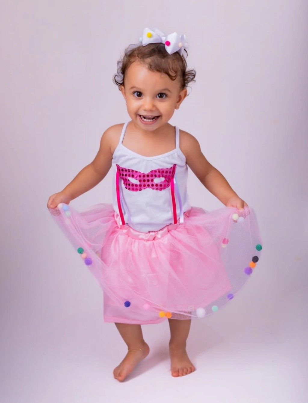 Nosso conjunto Folia foi desenvolvido pensando no conforto da criançada, regata feita em malha 100% algodão com aplicação em paetê e fita de cetim, e para completar o look e deixar ainda mais divertido, nossa saia em tule duplo com pompons soltos por toda a roda, PURA DIVERSÃO