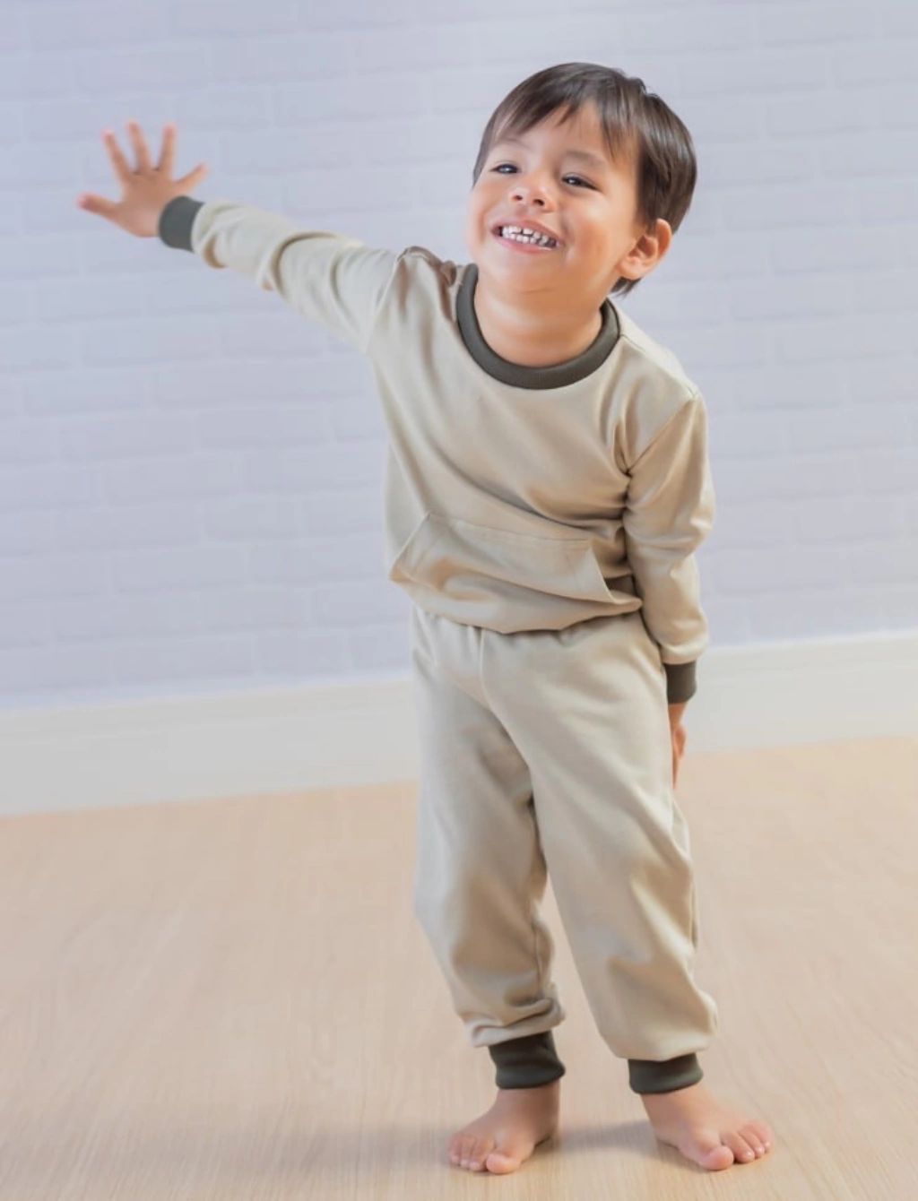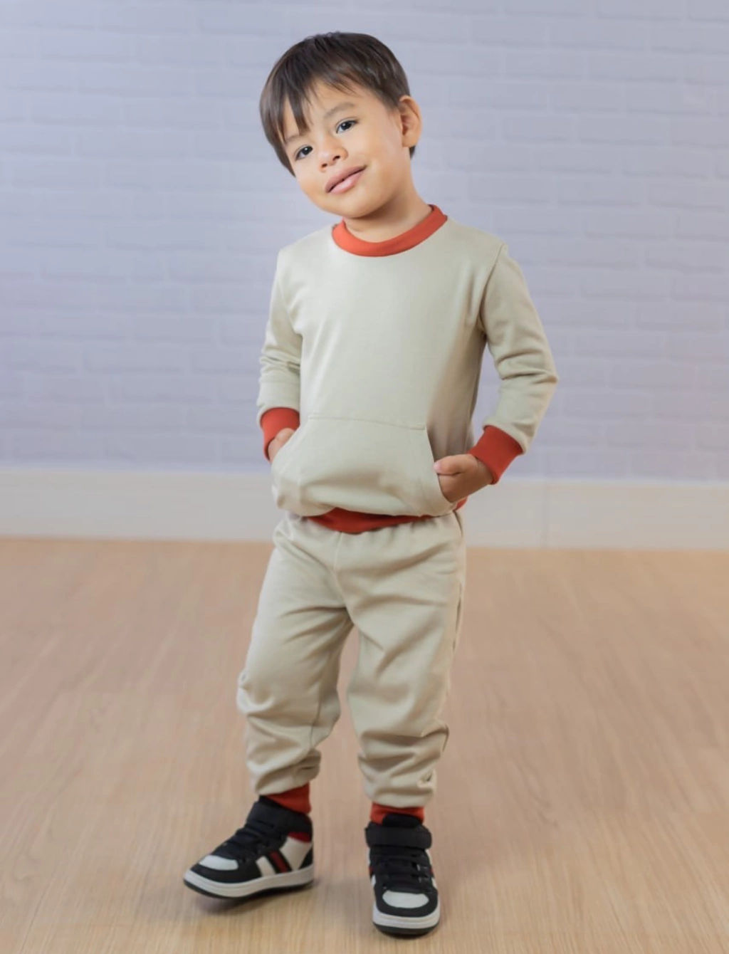 E claro, sabe aquele incômodo na criança pisando na barra da calça, ou até mesmo aquela manga cobrindo a mão? Nosso conjunto possui elástico na cintura, punhos nas mangas e pernas para não atrapalhar. E para finalizar com todo o charme neste Outono e aquecer as mãozinhas, a blusa contém bolso CANGURU na frente.