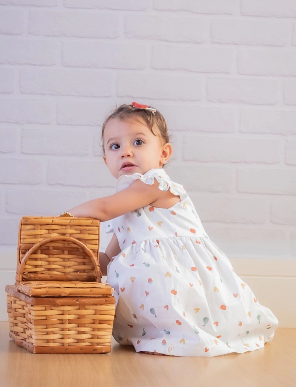 Nosso vestido Frutinhas foi desenvolvido em tecido 100% algodão com estampa digital, com babadinhos na manga e um decote nas costas que forma um lindo coração.